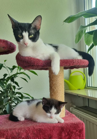 Daisy ist eine liebe, zutrauliche Katze. Beide sind sehr unkompliziert bei Nassfutter (mit Wasser gemischt), Trockenfutter ist nicht so ihr Ding.